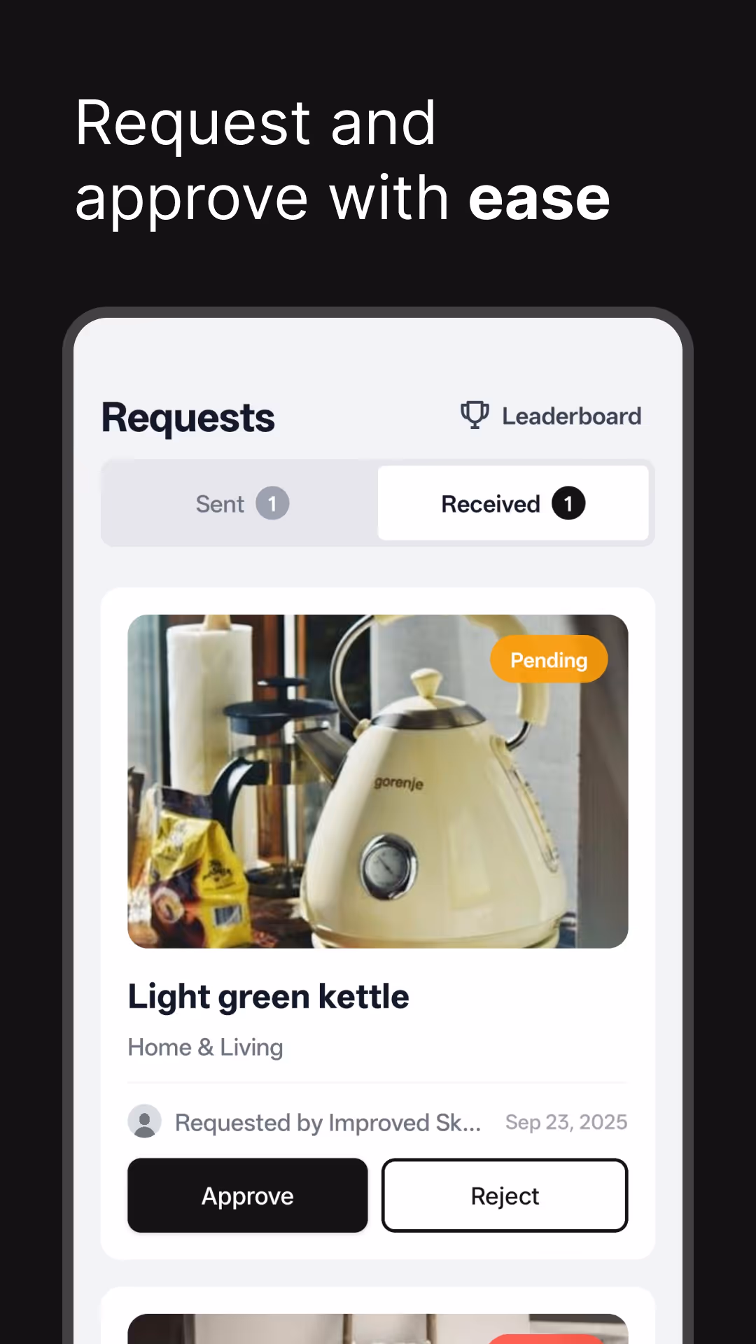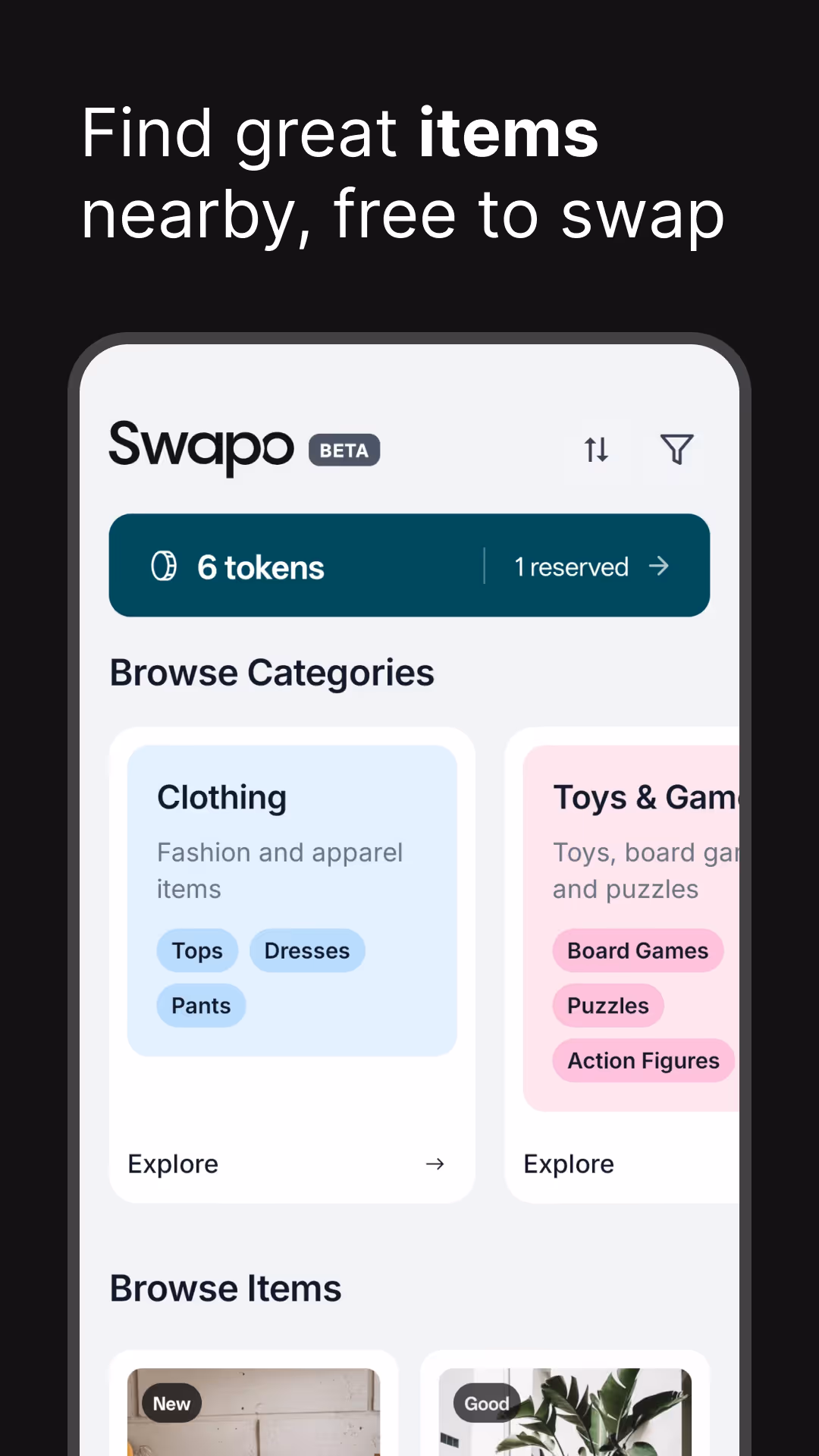 Trade with people close to you. Browse nearby listings, request what you like, and approve with a tap.
