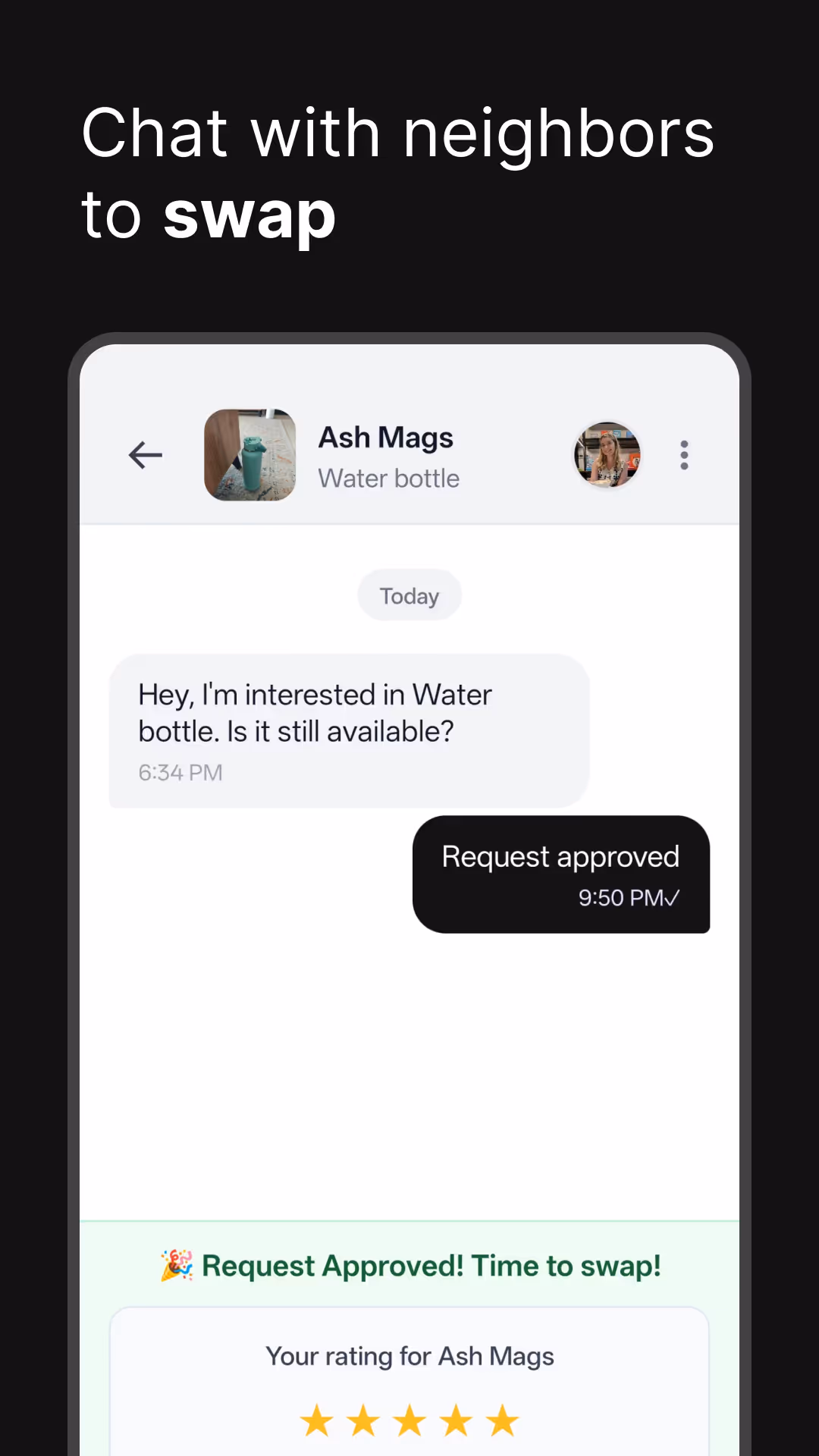 Profiles, approvals, and in-app chat keep swaps transparent and friendly.